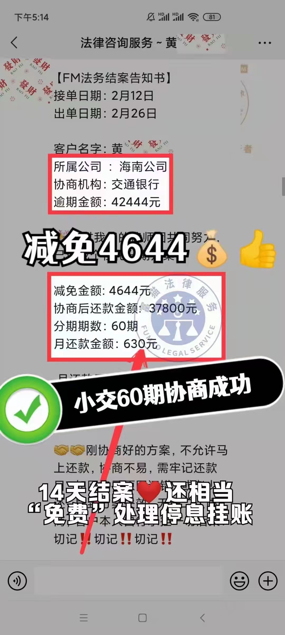 交通银行逾期4.2万,减免4644元后分60期还款